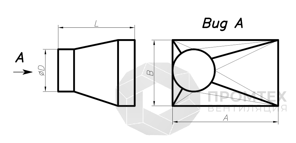 Переход используется, когда система воздуховодов одного сечения переходит на систему воздуховодов другого сечения.
